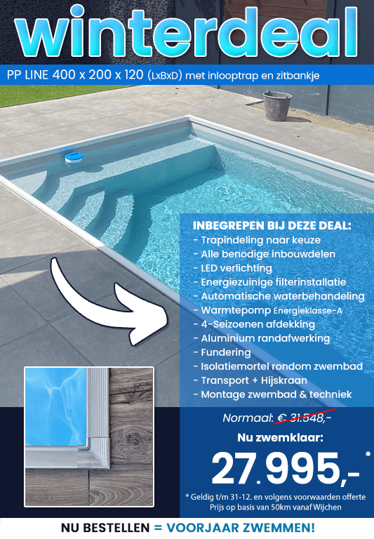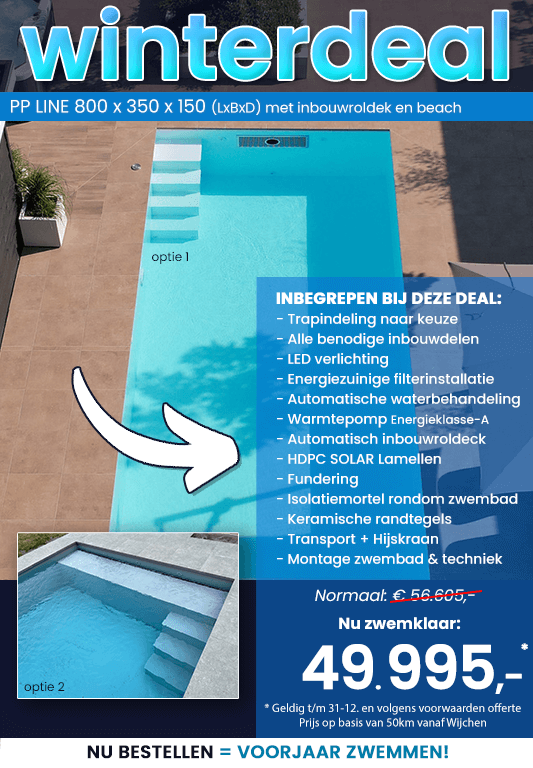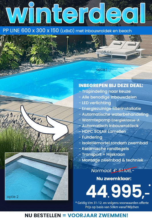 Bij onze aanbiedingen ontvangt u een totaalpakket dat alles omvat wat u nodig heeft om uw zwembad te installeren en te onderhouden. Van de zwembadpomp tot de filter, van de inbouwdelen tot het afdekzeil – wij hebben aan alles gedacht. Bovendien bieden wij professionele installatie en onderhoudsdiensten aan, zodat u zeker kunt zijn van een probleemloze en stressvrije ervaring, dit is echter niet inbegrepen bij onze aanbiedingen.